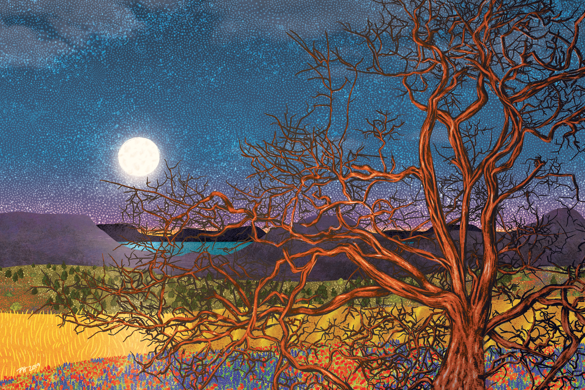 This commission imagined a moonlit landscape in the Texas Hill Country using a sketch of an old oak tree in Fredericksburg, TX. The tree and landscaping comprise thousands of vector brush strokes, overlapping textures, patterns, gradients, and masks.